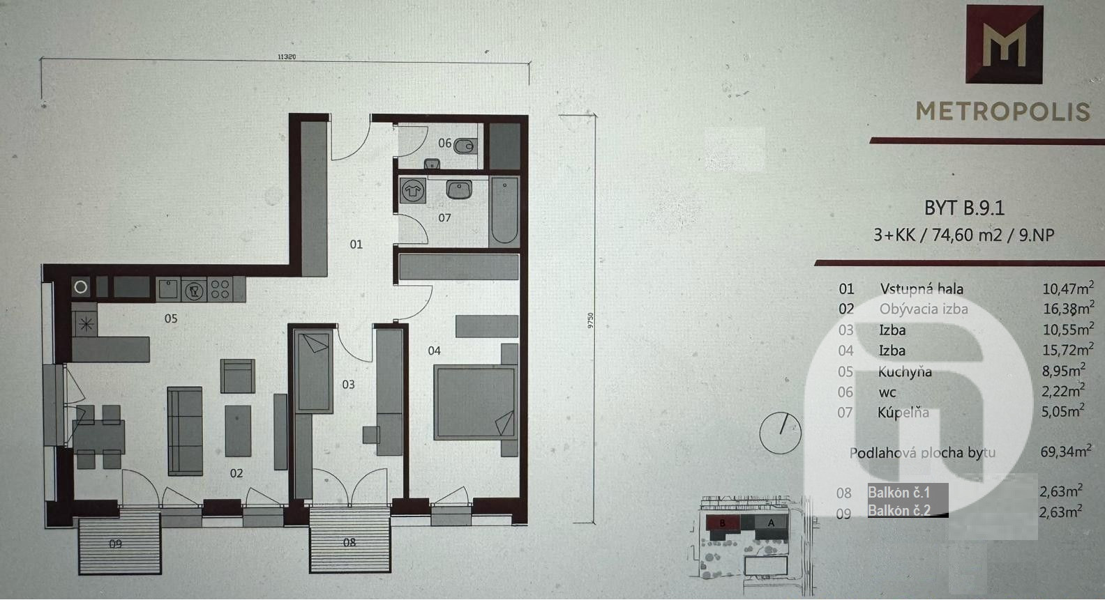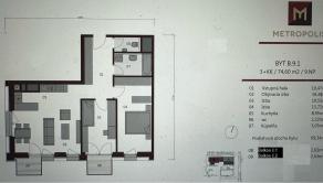 Byt má podlahovú plochu o výmere 69,34 m2 (bez plochy loggie 2 x 2,63 m2 = 5,26m2 ) s podrobnými detailmi v priloženom pôdoryse z dokumentácie. Nachádza sa na 8. poschodí ( 9. NP z 17). Byt pozostáva z 3 obytných miestností a príslušenstva, ktorým je chodba, kuchyňa s obývacou izbou, samostatná spálňa s šatníkom, detská izba, kúpeľňa, samostatná toaleta.