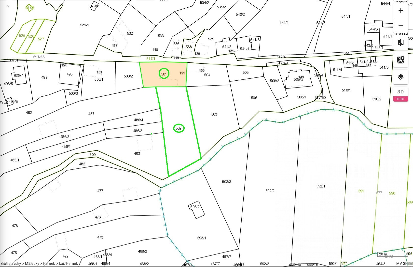 Ponúkame Vám na predaj stavebný pozemok s rozlohou 1583m² nachádzajúci sa na Záhori priamo pod Malými Karpatami v obci Pernek okres Malacky. Pozemok je v tvare otočeného „L“ a skladá sa z dvoch časti. Stavebný pozemok o rozlohe 475 m² a záhrada o rozlohe 1108 m². Terén je členitý vo svahu. Horná menšia časť je stavebný pozemok pri asfaltovej obecnej ceste. Dolná väčšia časť je záhradný pozemok ukončený prírodným potokom. Prístup k nehnuteľnosti je z hornej časti od asfaltovej cesty. Pozemok poskytuje súkromie s krásnym výhľadom na kopce a lesy. Na pozemku sa nachádzal trojpodlažný pôvodný rodinný dom s pivnicou, bol ostránený po základovú dosku so zachovaným čiastočným podpivničením . Inžinierske siete voda, plyn, elektrina, studňa na pozemku. Kanalizácia bola riešená formou septiku. V obci je výborná občianska vybavenosť, obchod s potravinami, pošta, škola, škôlka, vzdialenosť od Bratislavy je cca 35 km, do Malaciek je to cca 10 km, v blízkosti sa tiež nachádza kopec Pezinská Baba, kde je lyžiarske stredisko. Autobusové spojenie smer Senica / Rohožník - BA spoj č. 269, tiež cez babu do Pezinku.