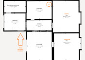 Dom pozostáva zo vstupného zádveria, z ktorého sa vchádza do technickej miestnosti s výstupom na povalu. Ďalej chodbou do kuchyne s jedálenským kútom a do obývacej miestnosti. Z chodby je tiež vstup do spálne a tiež vstup do priestrannej kúpeľne s toaletou. Obývačka a spálňa sú nepriechodné samostatne izby predelené priečkou, ktorá nie je nosná.