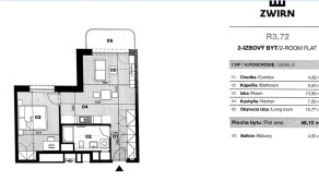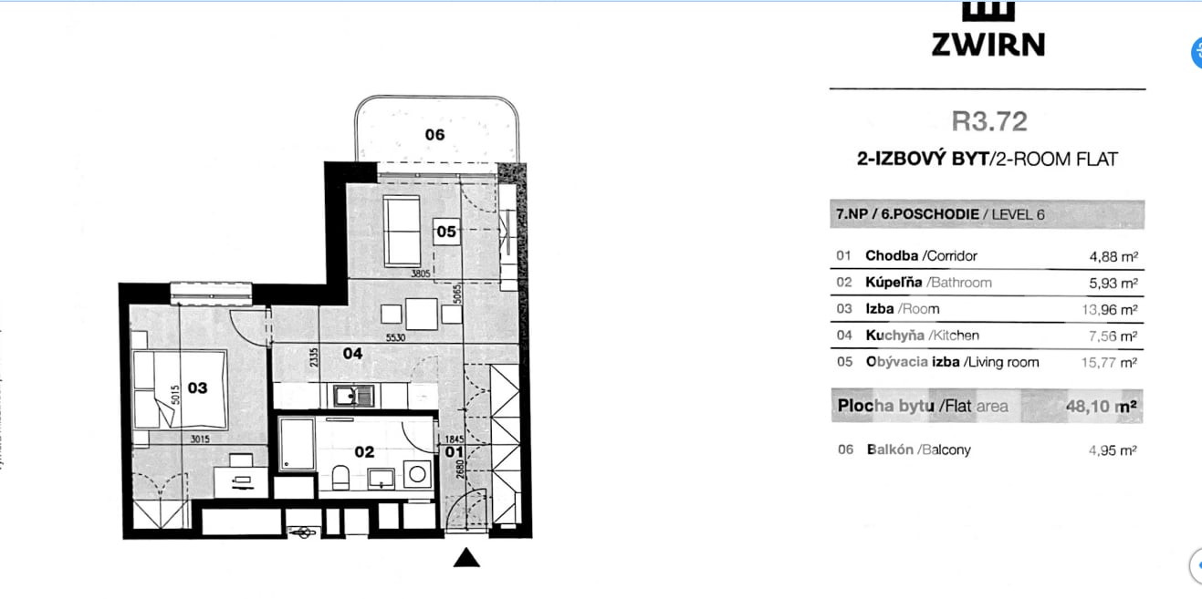 Byt má podlahovú plochu o výmere 48,10 m2 (bez plochy loggie 5 m2 ) s podrobnými detailmi v priloženom pôdoryse z dokumentácie od developera YIT. Nachádza sa na 6. poschodí ( 7. NP z 7. Byt pozostáva z 2 obytných miestností a príslušenstva, ktorým je chodba, kuchyňa s obývacou izbou, samostatná spálňa, kúpeľňa s toaletou, pivnica o výmere 2,3m2.