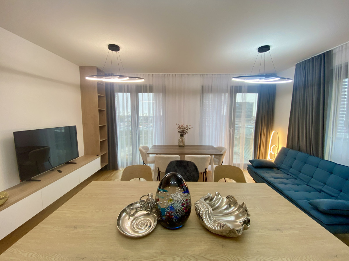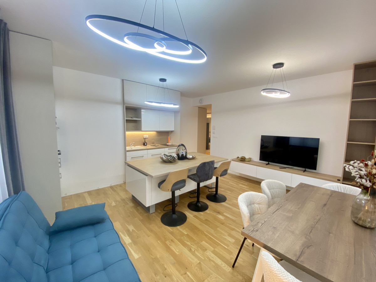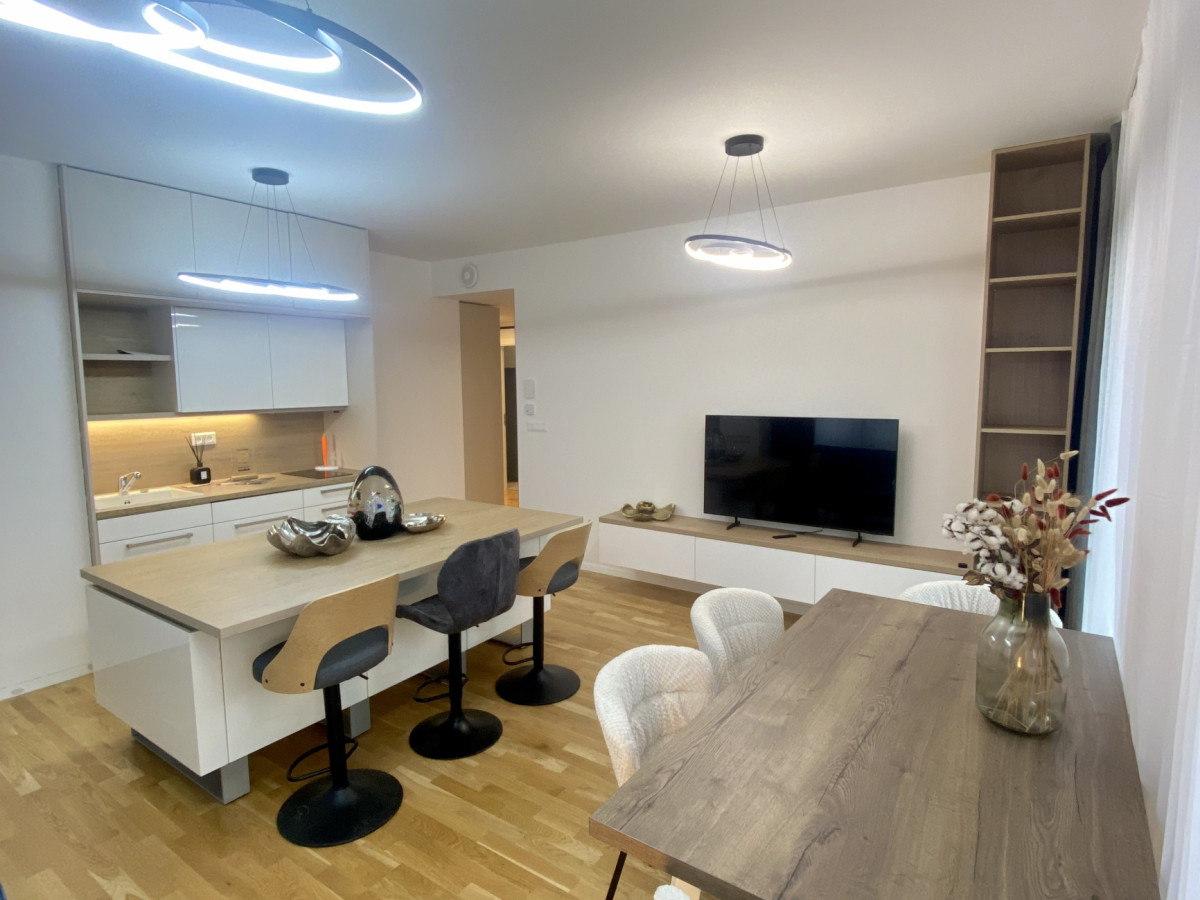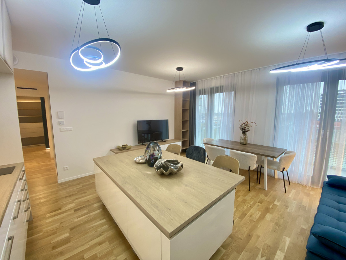 Podlahová plocha 69,34 m² + 2 balkóny (spolu 5,26 m²). Byt na 8. poschodí zo 17, nikdy neobývaný, kompletne zariadený na mieru. Dispozícia: chodba, obývacia izba s kuchyňou, samostatná spálňa so šatníkom, detská izba, kúpeľňa a samostatná toaleta.