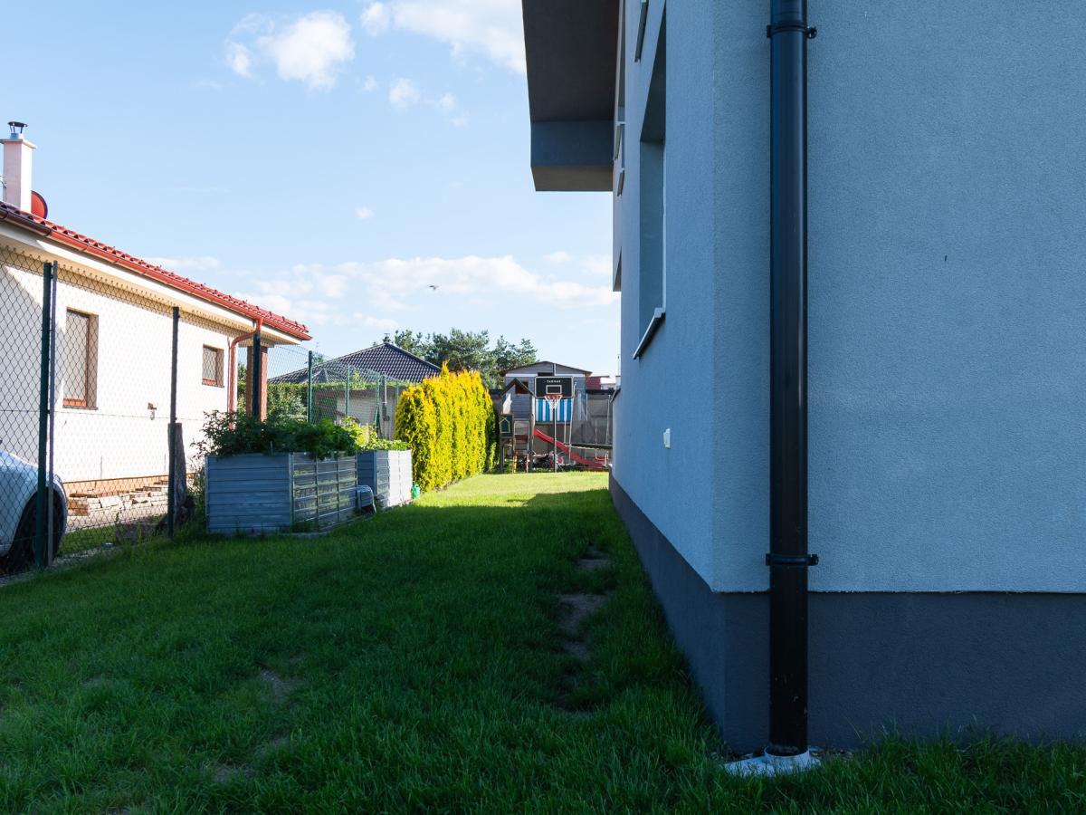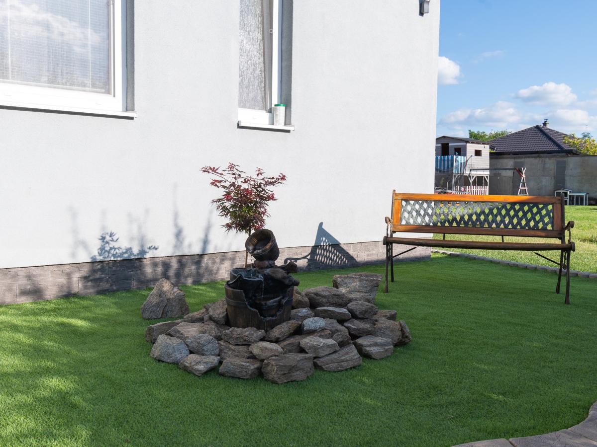 Exteriér: bazén 3 × 4 m s filtráciou, solárna sprcha, altánok s kôlňou (8 × 5 m), garáž s elektrickou bránou Nice, zavlažovanie Gardena, 2 studne, zámková dlažba. Parkovanie pre 3+ autá.